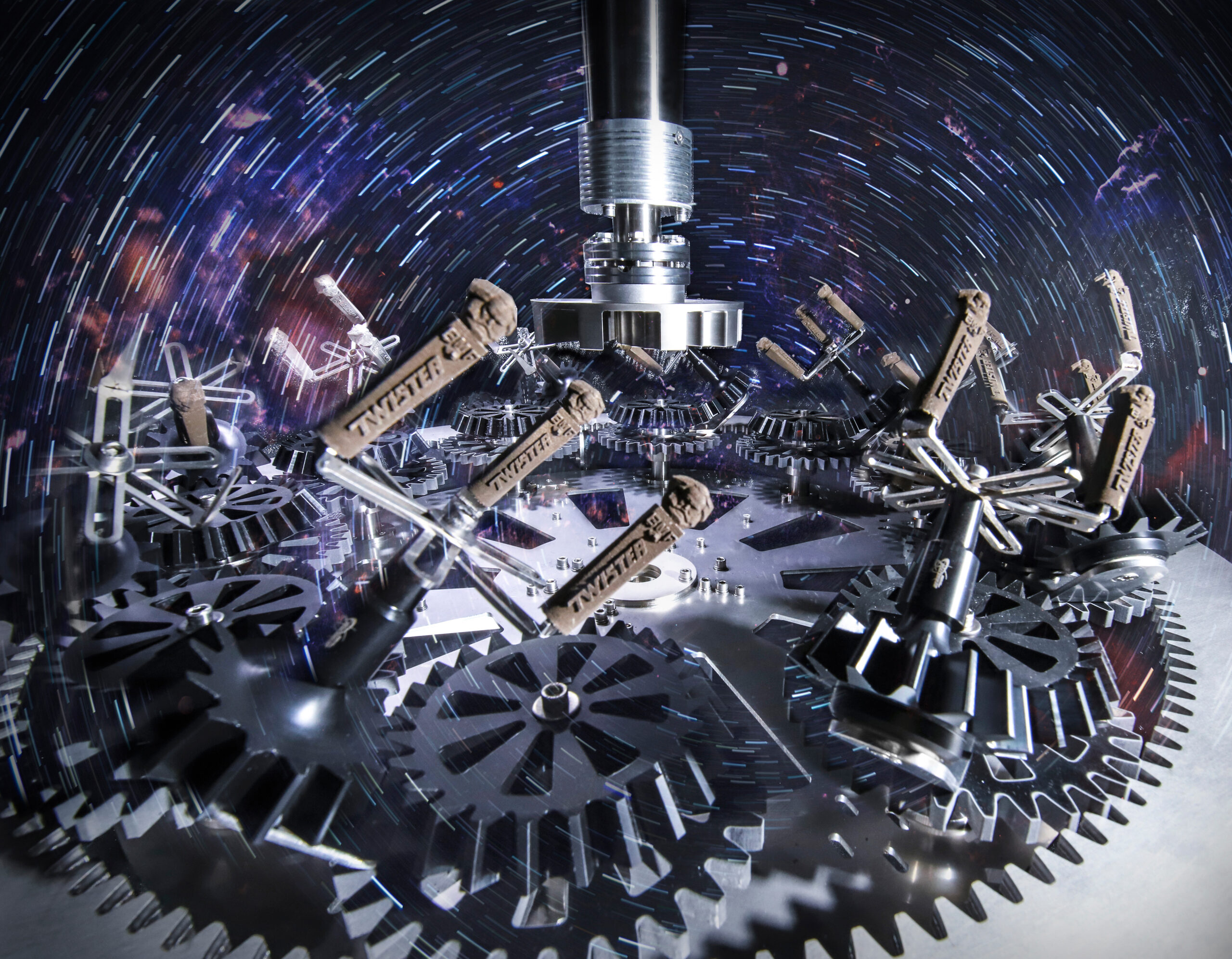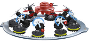 Grundsätzlich erfolgt die Bearbeitung ohne Druckluft nach dem Schleuderradprinzip. In allen 3 Strahlanlagen kommt ein zentrales Schleuderrad (1) zum Einsatz, das Strahlmittel mit hoher Präzision auf rotierende Werkstücke schleudert. Dabei wird eine Wolke aus Strahlmittel erzeugt, kein fokussierter Strahl. Das Schleuderrad verfügt über eine patentierte Schaufelgeometrie, die eine präzise und effiziente Strahlbearbeitung ermöglicht und ganz nebenbei das Strahlmittel schonend behandelt.
